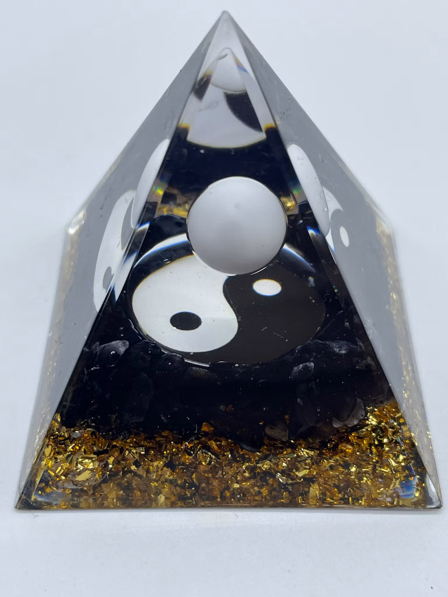 Mycket vacker Orgonitpyramid. Måttet är 5cm*5cm i basen och ca 5cm hög. Det finns även en passande belysning att köpa till. Sök på lampa.