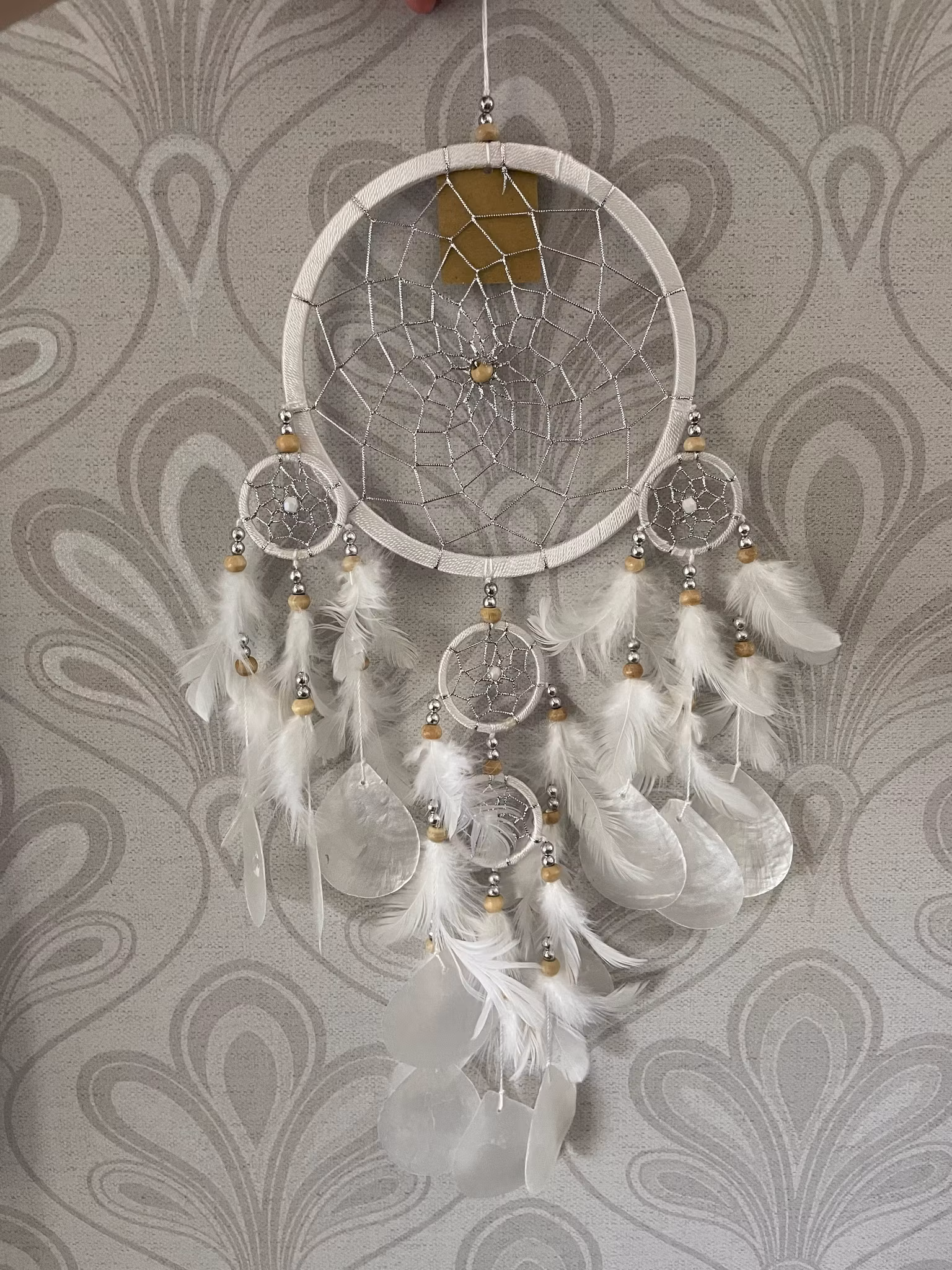Otroligt vacker drömfångare med naturligt fallna fjädrar (cruelty free) och pärlemoskimrande snäckskal med matchande vita fjädrar.