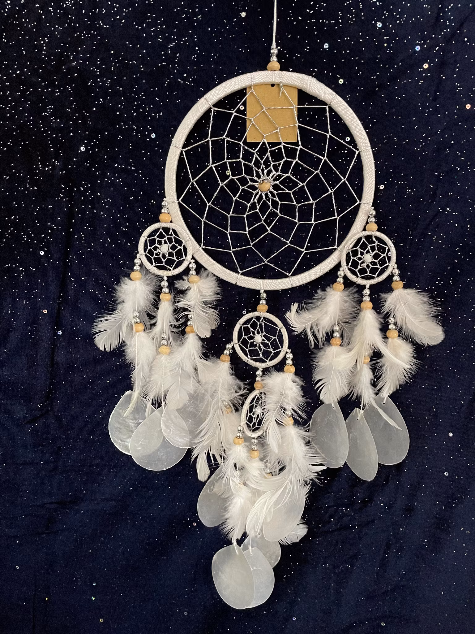 Drömfångaren består av vita ringar med silvernät. Det är en större ring på 16cm och 4 mindre som är 5cm. Totallängd exkl. hänget är ca47cm