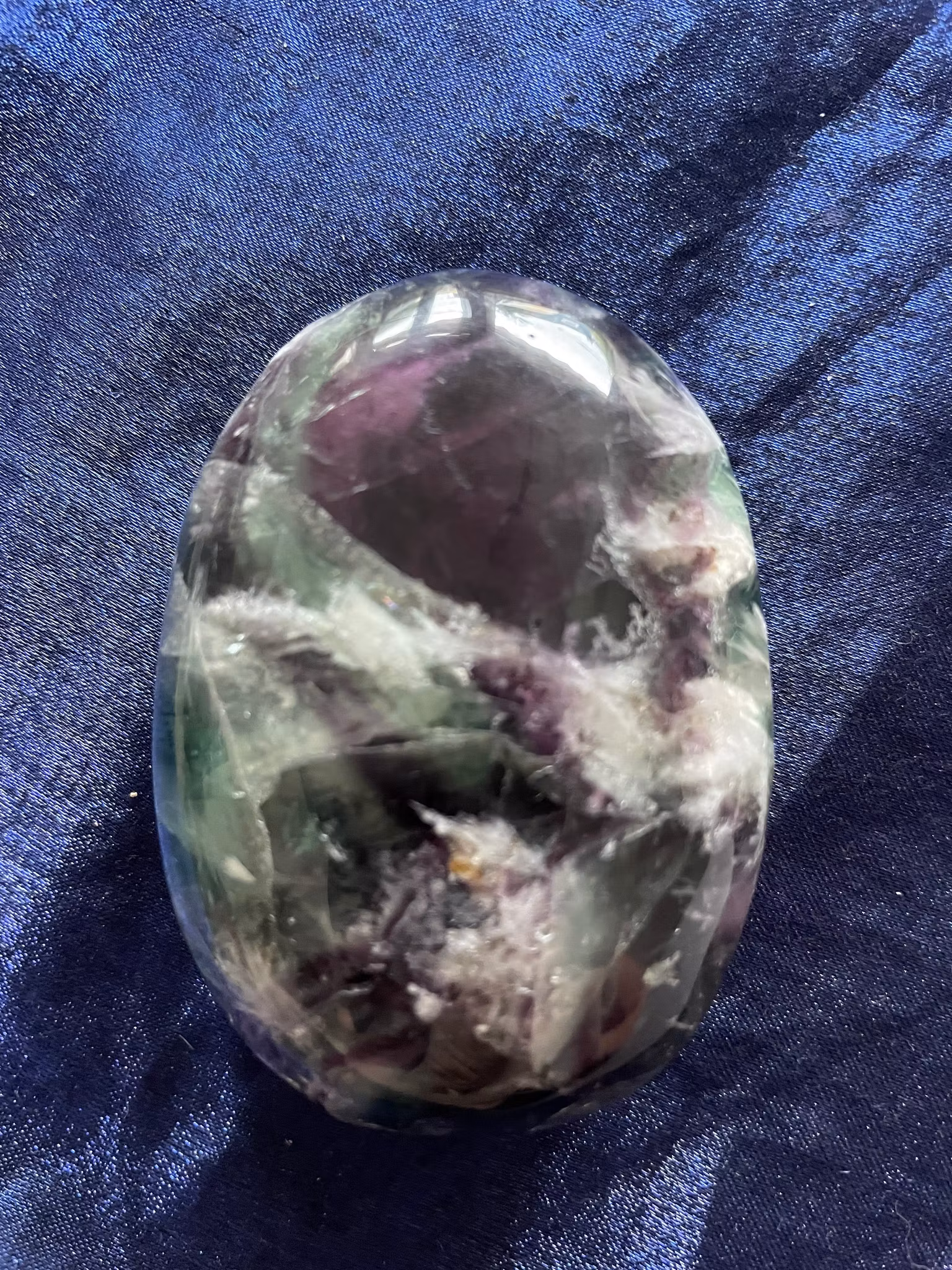 Egenskaper som det säga att Fluorit har: beskyddar dig och för in mer flow och kreativitet i ditt liv. Fluorit ökar din intuition och skapar en direkt koppling till universum och andligheten. Renar din aura. En perfekt meditations sten.