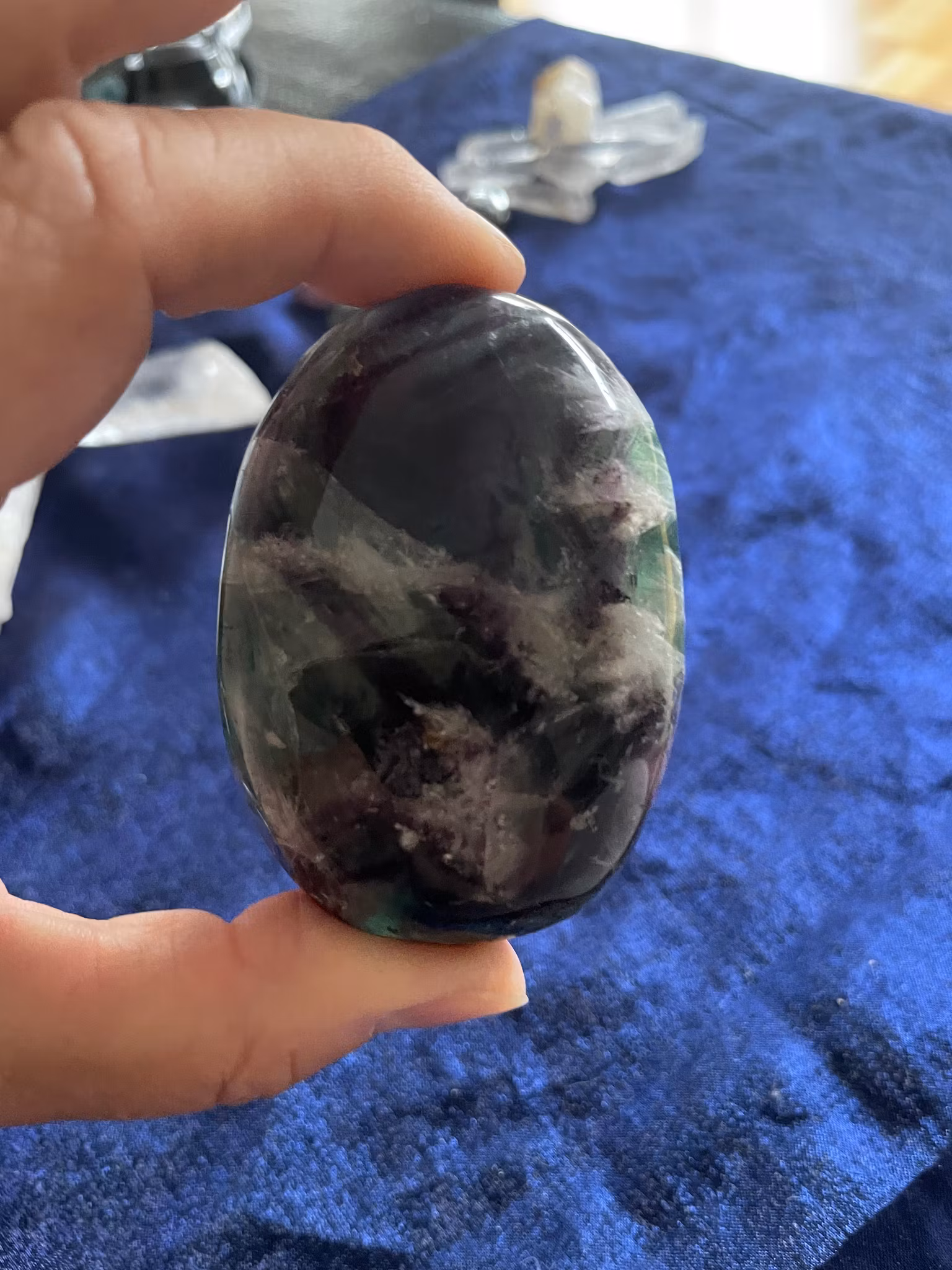 Fluorit Palmstone. Den är ca 6,5cm lång, 5,5cm bred och väger 164gram.