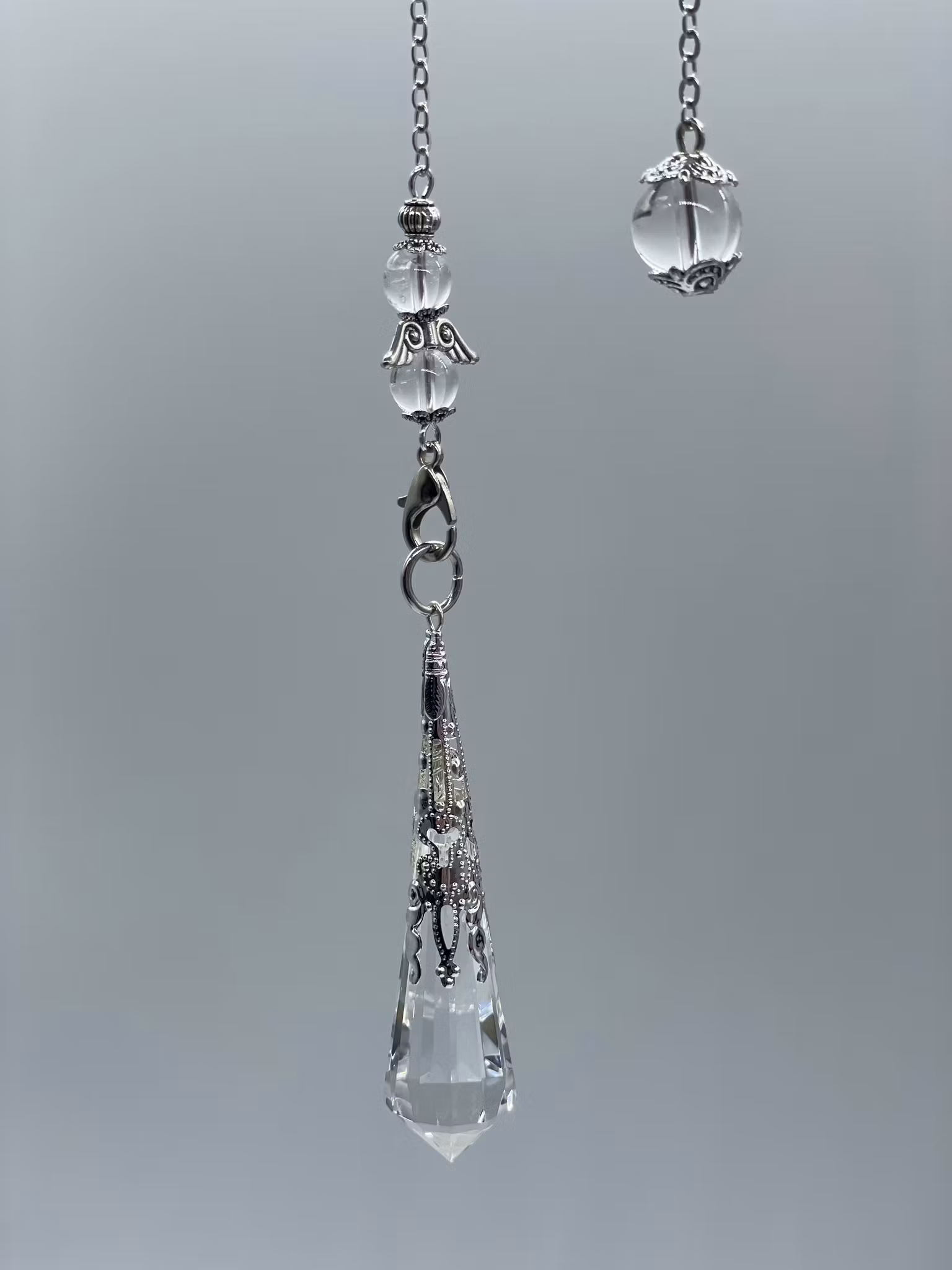 Vacker spetsformad pendel i Bergkristall med fin silverfärgad kedja.
