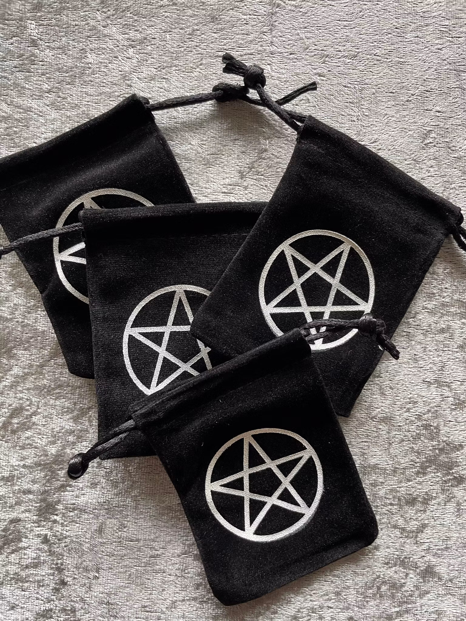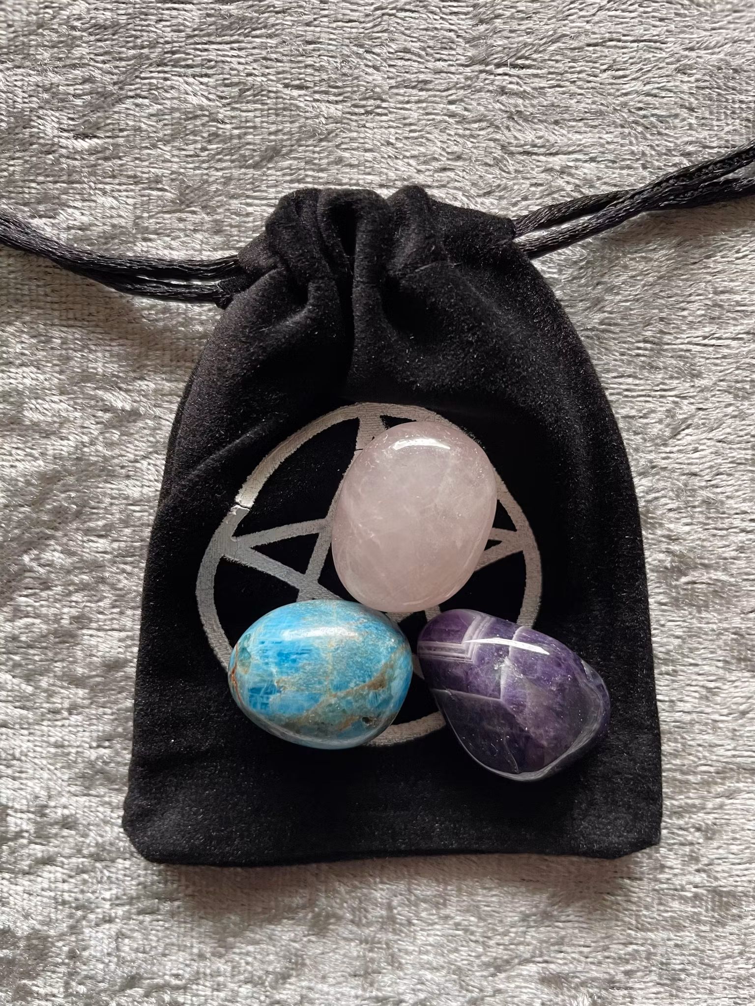 Svart sammetspåse med pentagram. Mått 10cm * 7,5cm. Praktisk förvaring av trumlade kristaller som du vill ta med dig i fickan.
