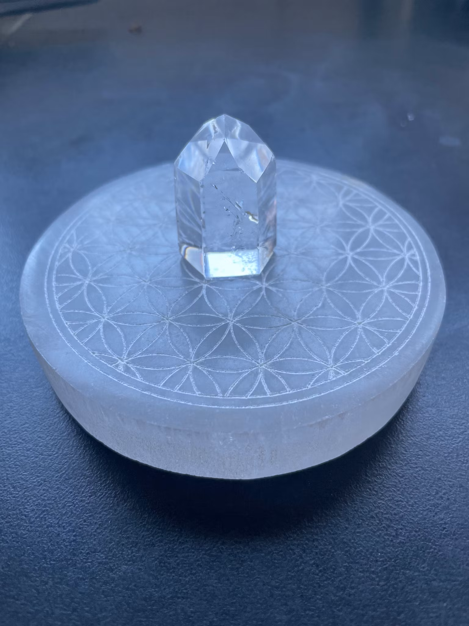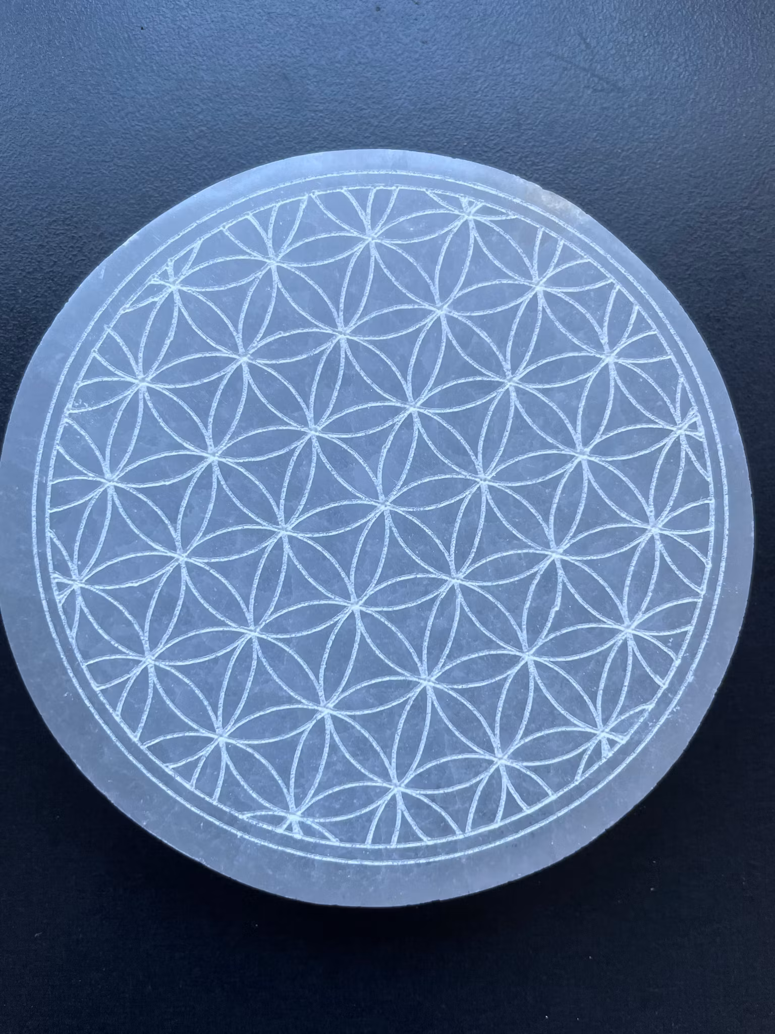 Rund Selenit laddningsplatta med mönstret livetsblomma på. Här kan du ladda dina smycken eller andra kristaller på. Går även att ha som kristallnät för mindre kristaller.