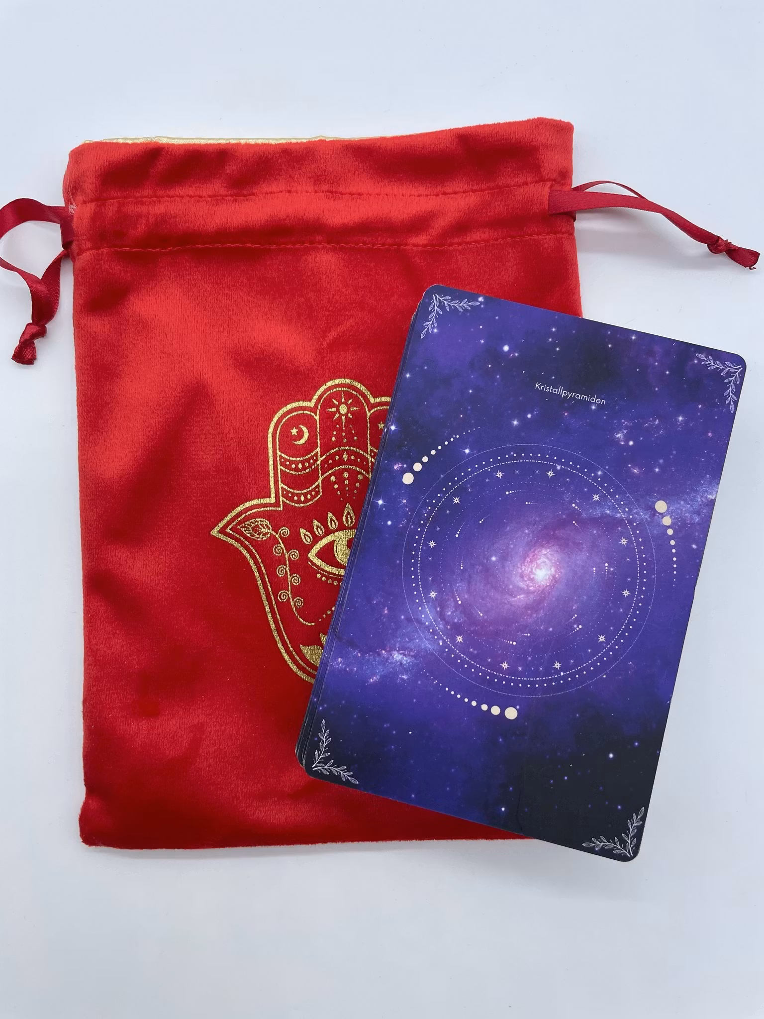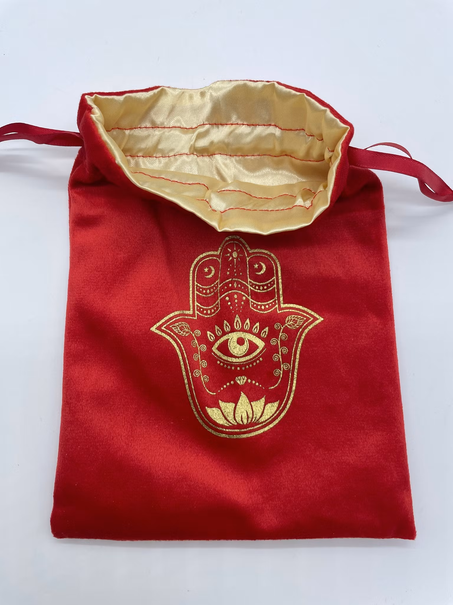 Fin röd sammets påse med symbolen Hamsa i guld på. Inuti är den ljus gul. Påsen är så pass stor att en Orakelkortlek med mått 13cm *8,5cm går ner. Och det får plats några kristaller eller en pendel i hop med korten också.