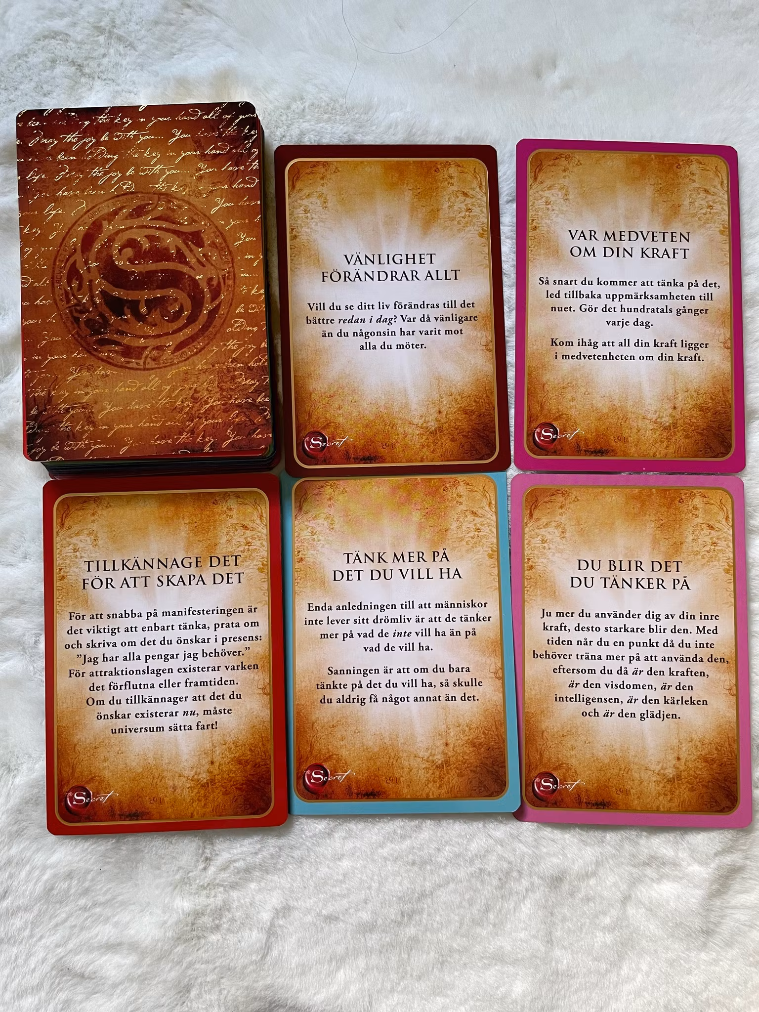 The secret, visdomskort för manifestering av Rhonda Byrne. 68st kort och ett 16sidigt häfte på svenska.